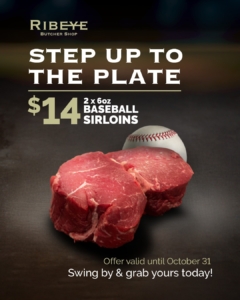 We’re gearing up for October baseball with a special on baseball sirloins. Get 2, 6 oz. baseball sirloin steaks for $14.